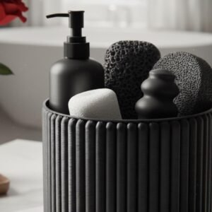 This ribbed organizer calms bathroom counters with two compartments: a larger one for cotton pads, creams, or toiletries, and a smaller one for Q-tips or brushes. Its minimalist lines and ribbed walls add strength and a modern, understated elegance, making it robust enough for daily use.