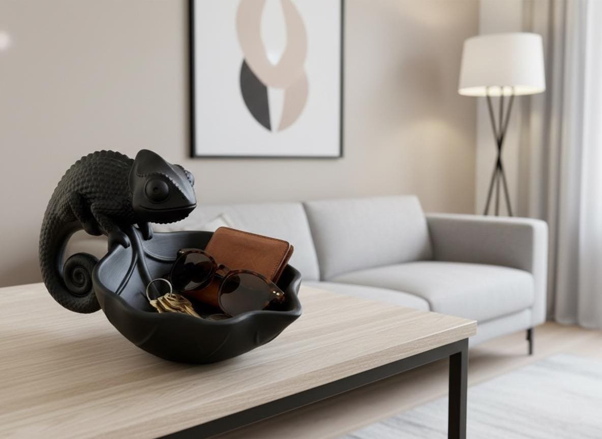 Perfect for nature lovers and reptile enthusiasts, this detailed chameleon perched on a leaf serves as a functional and artistic piece of decor. Whether you need a spot for your keys in the entryway, a ring holder on your nightstand, or a unique desk organizer for paperclips and small items, this little guy has you covered.