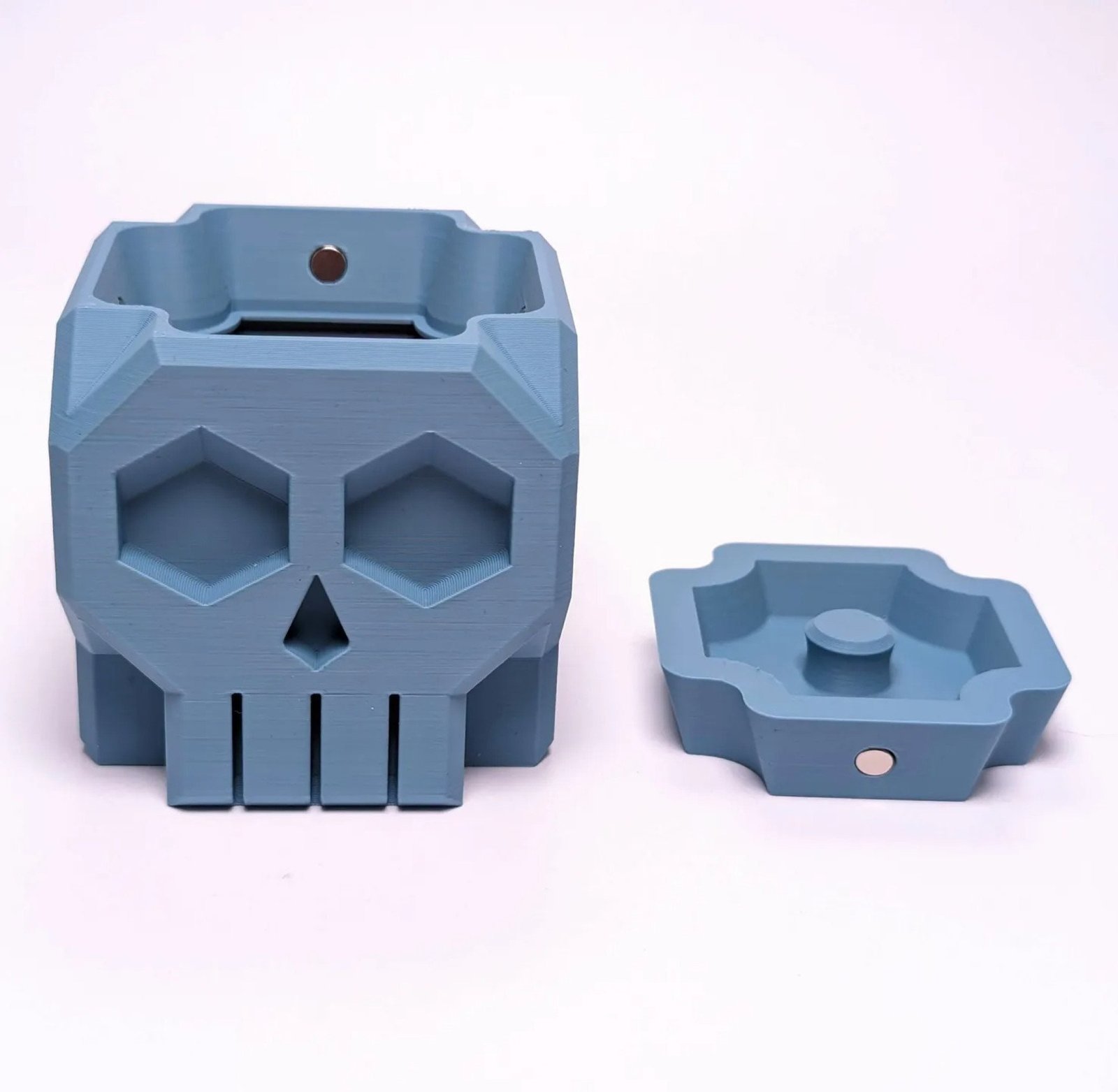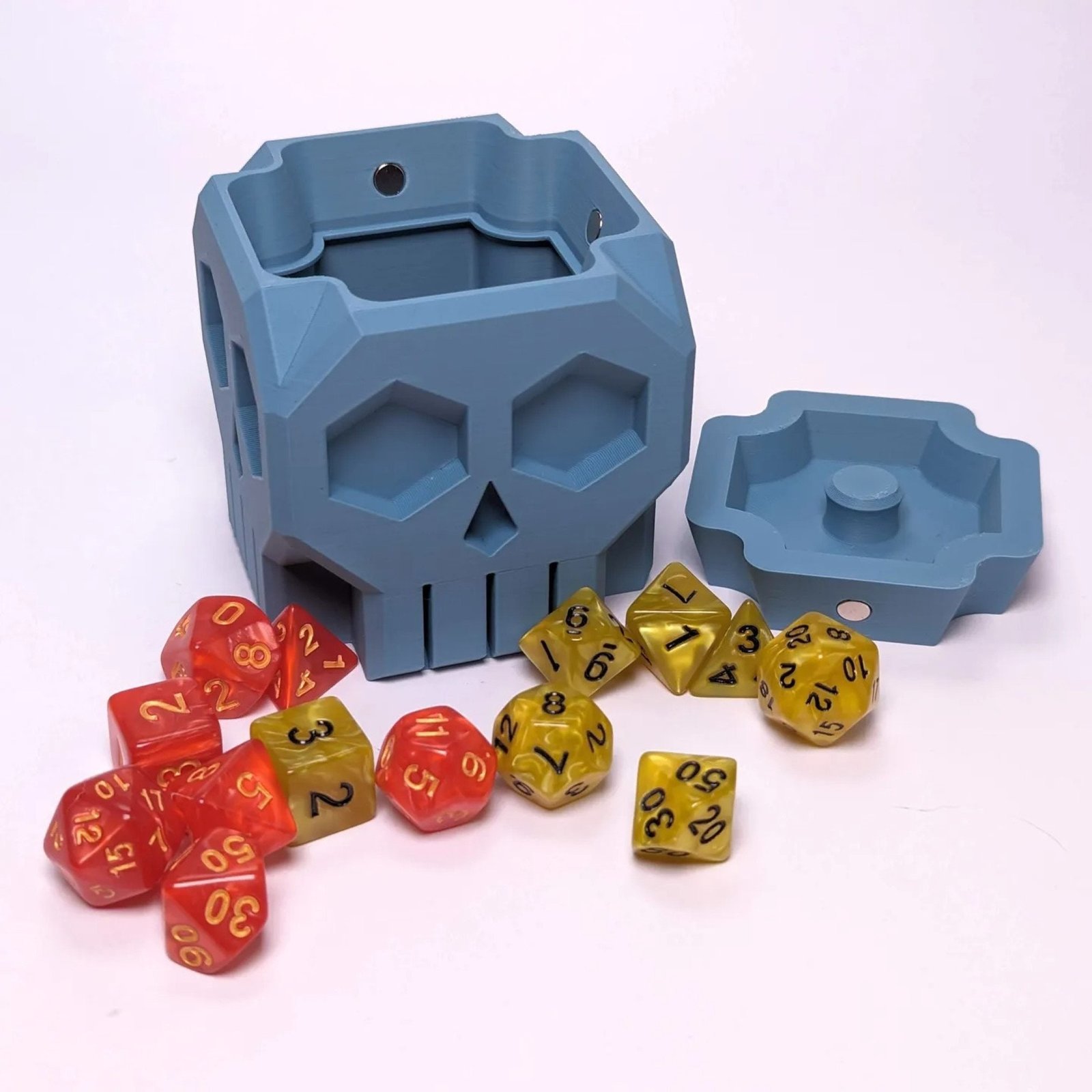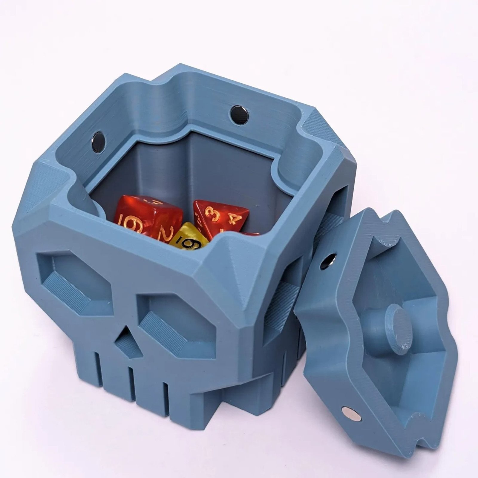Designed specifically for tabletop gaming enthusiasts! This unique dice storage solution combines functionality with an eerie aesthetic that’s perfect for your gaming sessions. Magnets are placed inside to securely hold your lid to prevent your dice from falling out! Choose to customize your Skull Dice Box with a variety of color options.