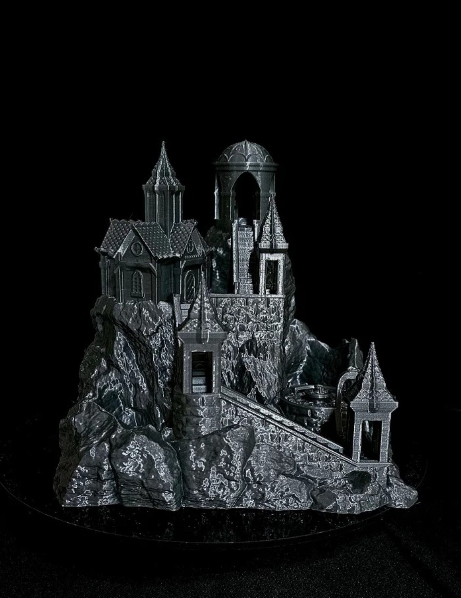 A diorama of a forgotten small town from a fantasy world. Choose from a variety of colors and tricolors. Tricolors shift colors between the 3 colors.