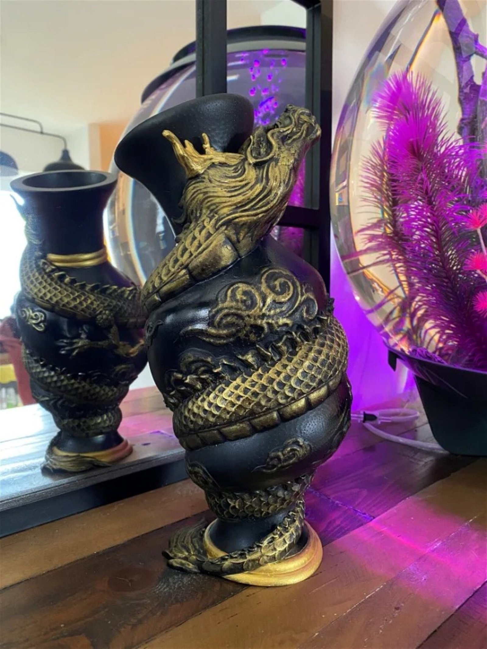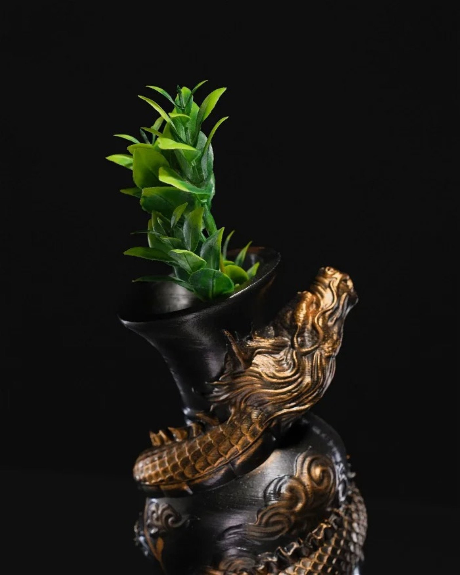 This 3d printed Vase comes hand painted with a golden dragon wrapped around the black vase. Made of ABS Plastic, this vase provides extra strength and durability for your plant inserts. A great gift to give for any fan of dragons or old ancient themed home decor.